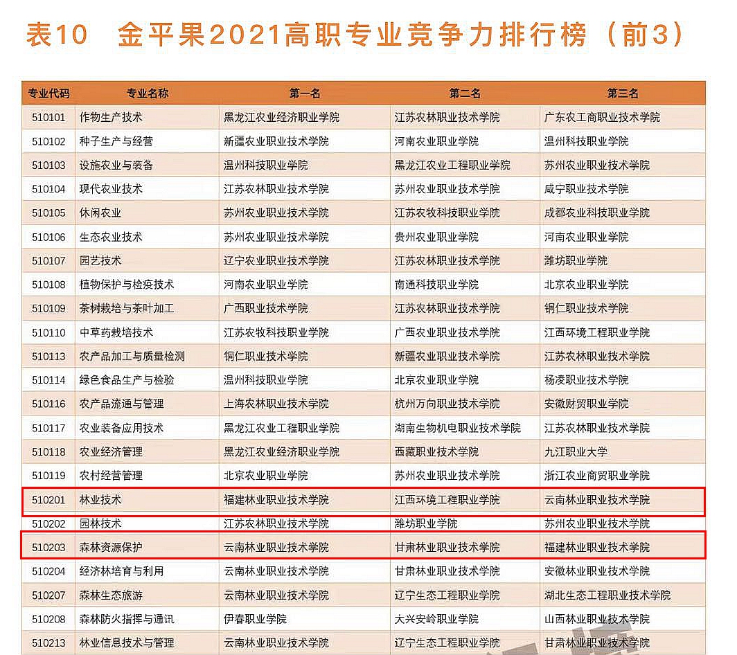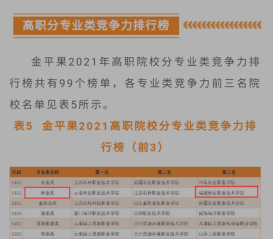 本网讯 近日,“金平果”首次发布高职专业群综合竞争力评价数据,并第二次发布高职专业排行榜,我院荣登高职分专业类竞争力排行榜林业类专业全国第三名!林业技术专业位列高职专业竞争力排行榜全国第一!森林资源保护专业位列全国第三!