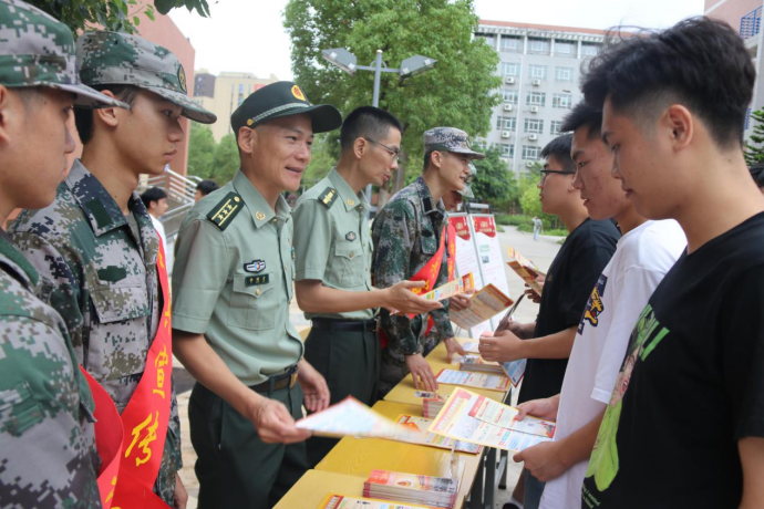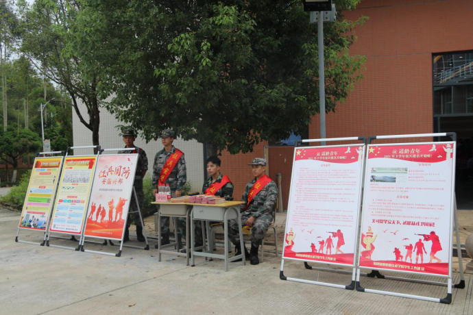 会场外,还专设了大学生应征入伍政策咨询点和大学生参军入伍宣传栏,向学生发放宣传资料,对学生关心的应征入伍有关问题进行解答。