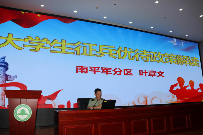 宣讲会结束后,南平军分区动员处叶章文参谋给参会人员介绍大学生入伍流程、享受的优惠政策、国家资助办法、保留入学资格及退役后入学流程、大学生参军入伍发展平台、退役后创业就业、退役后升学等一系列政策制度。