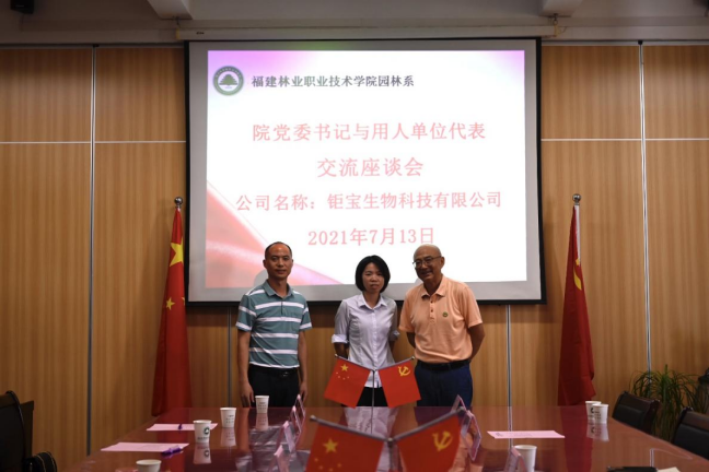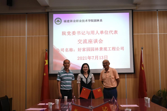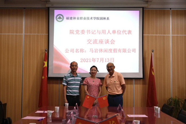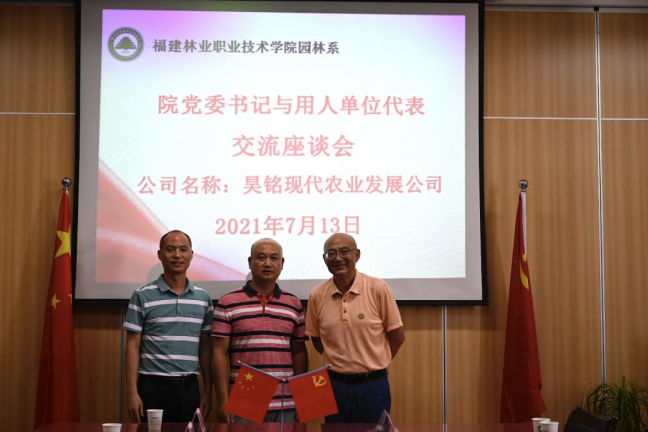 本网讯 为响应教育部关于“鼓励职业院校的书记、校长带头联系100家以上的企业”号召,2021年7月13日下午,院党委书记万泉与园林系校企合作企业座谈交流。参加此次座谈会的企业有福建昊铭现代农业发展有限公司、福建省南平市良种生物科技有限公司、沙县马岩休闲度假有限公司、福建好家园园林景观工程有限公司、漳州钜宝生物科技有限公司、南平市景隆办公用品有限公司、福建省南平市宏福建设工程有限公司共七家公司。本次座谈会由园林系党总支书记陈剑勇主持。园林系组织员吴慧敏以及毕业生专兼职辅导员一同参加了座谈会。