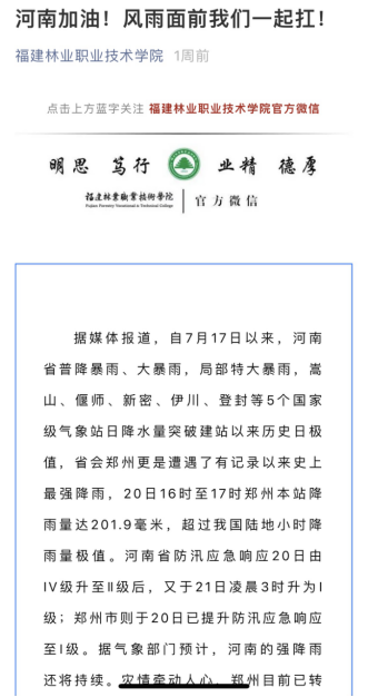 7月17日以来,河南省遭遇极端强降雨,灾情牵动着全国人民的心,也牵动着学院每一个人的心。福建林业职业技术学院党委高度重视,密切关注河南籍学生家庭的受灾情况,迅速启动灾区学生临时困难补助专项工作,第一时间发布通知,如学生家中因洪涝灾害造成人员伤害或经济损失,导致家庭经济出现临时困难,可向学院申请特殊困难补助,帮助学生渡过难关。