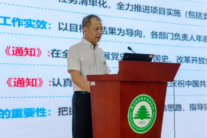 紧接着,院党委副书记、院长刘文开以《聚焦重点 统筹推进学院高质量发展》为题,对学院新学期工作提出新思路、新目标、新举措。刘文开院长首先对暑期仍然坚持在教学及工作岗位上辛勤工作的教职工表示感谢,随后对学院新学期工作进行了详细安排部署:一是要按年度党政工作要点推进学院各项工作。完成党委通过的学院年度工作要点是各部门特别是各部门党政负责人应履行的工作责任,要对标工作要点,制定强化措施,务求工作实效;二是要创造性推进福建省高水平院校建设。“双高计划”主题是高质量发展,主调是引领职业教育改革创新,学院要高标准定位、高水平设计、高效率实施、高效能产出、高质量发展;三是要做好新一届省级文明校园创建。文明校园是一个学校物质文明、政治文明和精神文明建设的最高荣誉,要严格按照创建要求和时间节点上传支撑材料;四是要落实落细校园安全稳定工作。坚决守住安全稳定底线,为学院可持续高质量发展提供基础保障。牢固树立安全发展理念,全面落实工作责任制,抓早抓小抓苗头,排查各种安全隐患,真正做到防患于未然;五是要认真抓好疫情防控,确保学院安全有序开学。疫情防控工作是当前的重大政治任务,要毫不放松抓好新冠肺炎疫情防控,统筹推进疫情防控和学院改革发展,落实好校园常态化疫情防控举措,压紧压实防控工作责任,确保师生员工健康安全;六是要明确学院“十四五”的办学定位与发展目标。“十四五”是学院构建新发展格局、全面开启新征程的第一个五年。学院“十四五”的办学定位是:服务生态文明建设、乡村振兴、中国制造2025等国家战略和新福建建设;发展目标是:以习近平总书记对福建工作提出的四个“更大”要求为指引,到2025年,办学条件总量指标达到本科层次职业学校设置标准,为提升办学层次奠定坚实基础。
