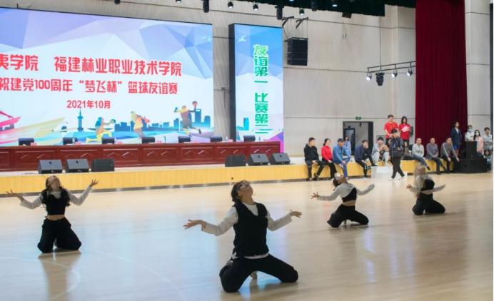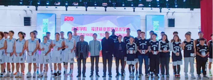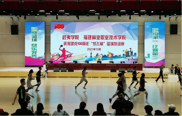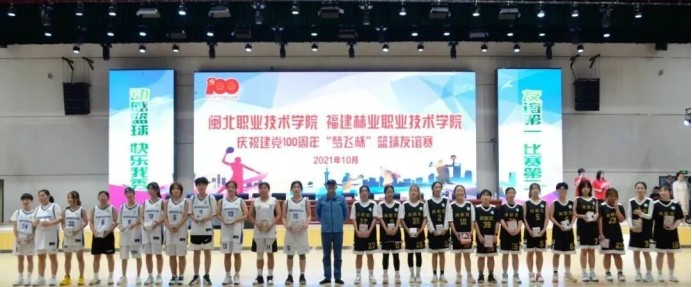 本网讯 百年征程波澜壮阔,百年初心历久弥坚。为庆祝中国共产党成立100周年,深入开展党史学习教育实践活动,进一步增进校际间交流,丰富校园文化活动,2021年10月21日、23日,福建林业职业技术学院、闽北职业技术学院、武夷学院在福建林业职业技术学院江南校区体育馆联合开展庆祝建党100周年“梦飞杯”大学生篮球友谊赛。林职院党委书记万泉、纪委书记林建斌、副院长谢金生,闽职院党委书记谢友平、院长叶世森,武夷学院体育教学部主任张国林应邀到场与林职院近1500名师生一同观看比赛。本次活动由林职院团委、艺术传媒系共同承办。