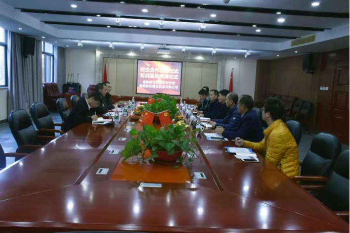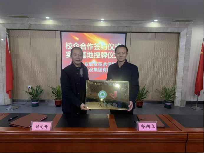 会议最后,刘文开院长与邱朝立总经理代表校企双方签订了合作协议,刘文开院长为福建新纪建设集团有限公司授予实训基地牌匾,并合影留念。
