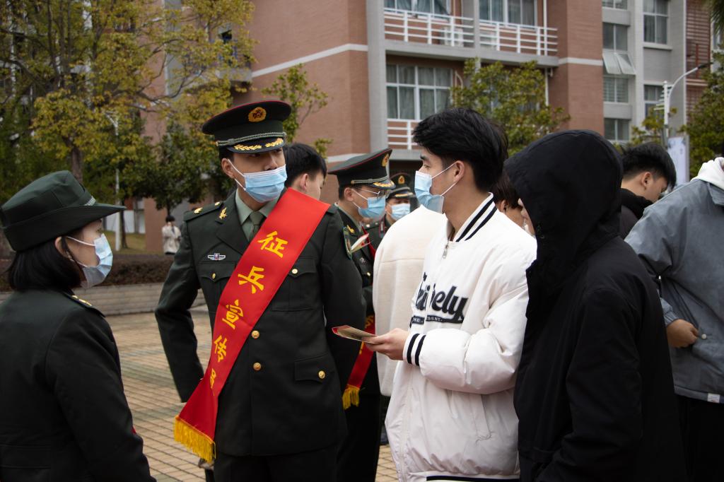 本网讯 为深入贯彻习近平强军思想,激发广大青年学子从军报国热情,扩大征兵宣传影响力和辐射面,12月29日,由南平市征兵办组织开展的“携笔从戎·不负韶华”征兵宣传暨高校征兵工作启动仪式在我院举行,标志着2022年南平市征兵工作全面展开。南平市军分区大校政委聂汉勋,我院党委书记万泉,南平市军分区大校副司令员蒋树兵,闽北职业技术学院副书记陶金辉,我院副院长谢金生,延平区副区长杨志华,南平军分区动员处上校处长李璜,南平军分区政工处上校主任郑林旋,延平区人武部上校部长李顺才出席了启动仪式,我院各系党总支书记、学生科长、辅导员及来自我院、闽北职业技术学院的300余名师生代表参加了启动仪式。