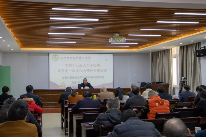 本网讯 党的十九届六中全会和省第十一次党代会召开后,全院上下都掀起了学习党的十九届六中全会和省第十一次党代会精神的热潮。为进一步深化学习,1月11日,福建省教育系统党史学习教育巡回指导四组到我院开展党的十九届六中全会和省第十一次党代会精神专题宣讲报告会。福建省教育系统党史学习教育巡回指导四组副组长、福建农林大学正处级干部叶青,福州大学统战部副部长高磐,福建教育学院办公室科员林木子出席报告会。
