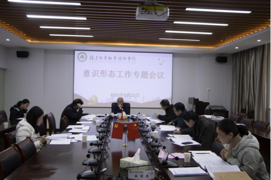 本网讯 2022年2月22日,学院党委在江南校区办公楼第一会议室召开意识形态工作专题会议,通报2021年意识形态工作专项督查情况,总结学院2021年意识形态工作,研究部署2022年意识形态工作。全体院党委委员及党政办主任参加了会议,会议由学院党委书记万泉主持。