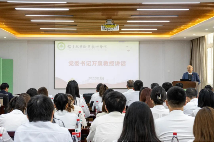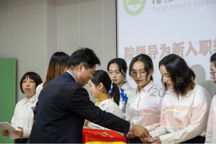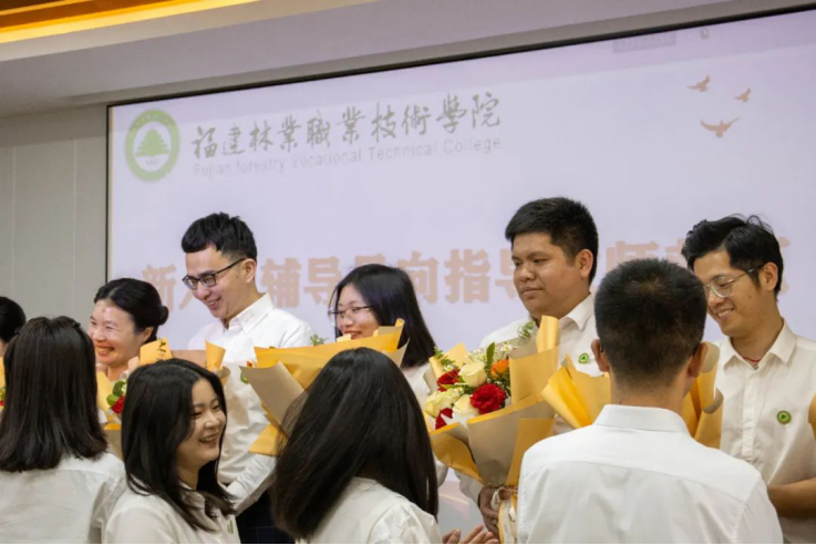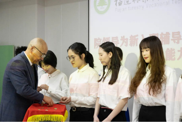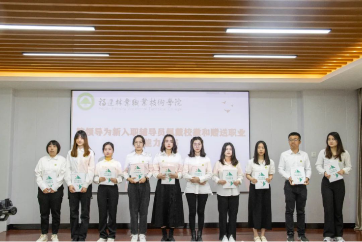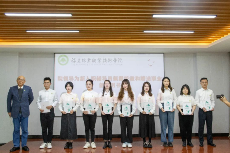 万泉书记、严绍裕副书记分别为新入职辅导员佩戴校徽和赠送辅导员职业能力用书,欢迎新辅导员加入林职院大家庭。