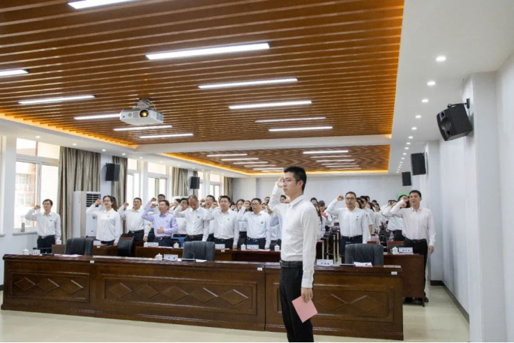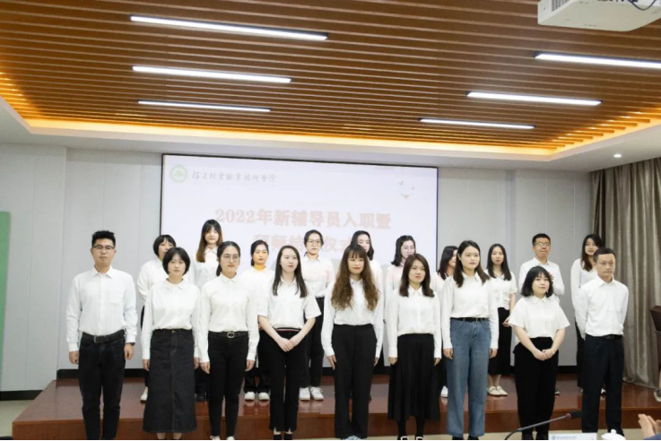 全体辅导员在学工部学生教育管理科科长吴旻的带领下,庄严宣誓:我志愿成为一名高校辅导员,拥护党的领导,献身教育事业,恪守职业规范,提升专业素养,情系学生成长,做好良师益友,为培养社会主义合格建设者和可靠接班人而努力奋斗!