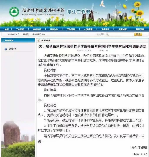 关心关爱“不掉线”。学院及时做好特殊学生群体的关心关爱和困难帮扶,第一时间化解学生的难题,疏导学生的心理。面向全院学生开放线上、线下心理咨询,开展线上心理电影展播、心理微电影大赛、线上心理知识答题竞赛、线上正念冥想团体辅导等丰富多彩的线上心理健康活动,做到线上线下随时切换,普及心理健康知识,树立正确的心理健康理念。同时,学院启动疫情防控期间学生临时困难补助申请工作,帮助因受疫情期间新冠肺炎影响的学生顺利渡过难关,按照《福建林业职业技术学院学生临时困难补助实施办法》相关规定给予资助。