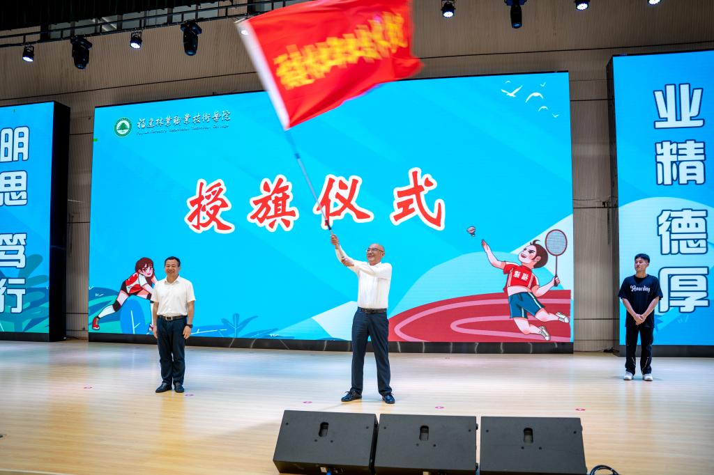 万泉书记向福建省第十七届运动会福建林业职业技术学院体育代表团团长罗立仪副院长授旗。