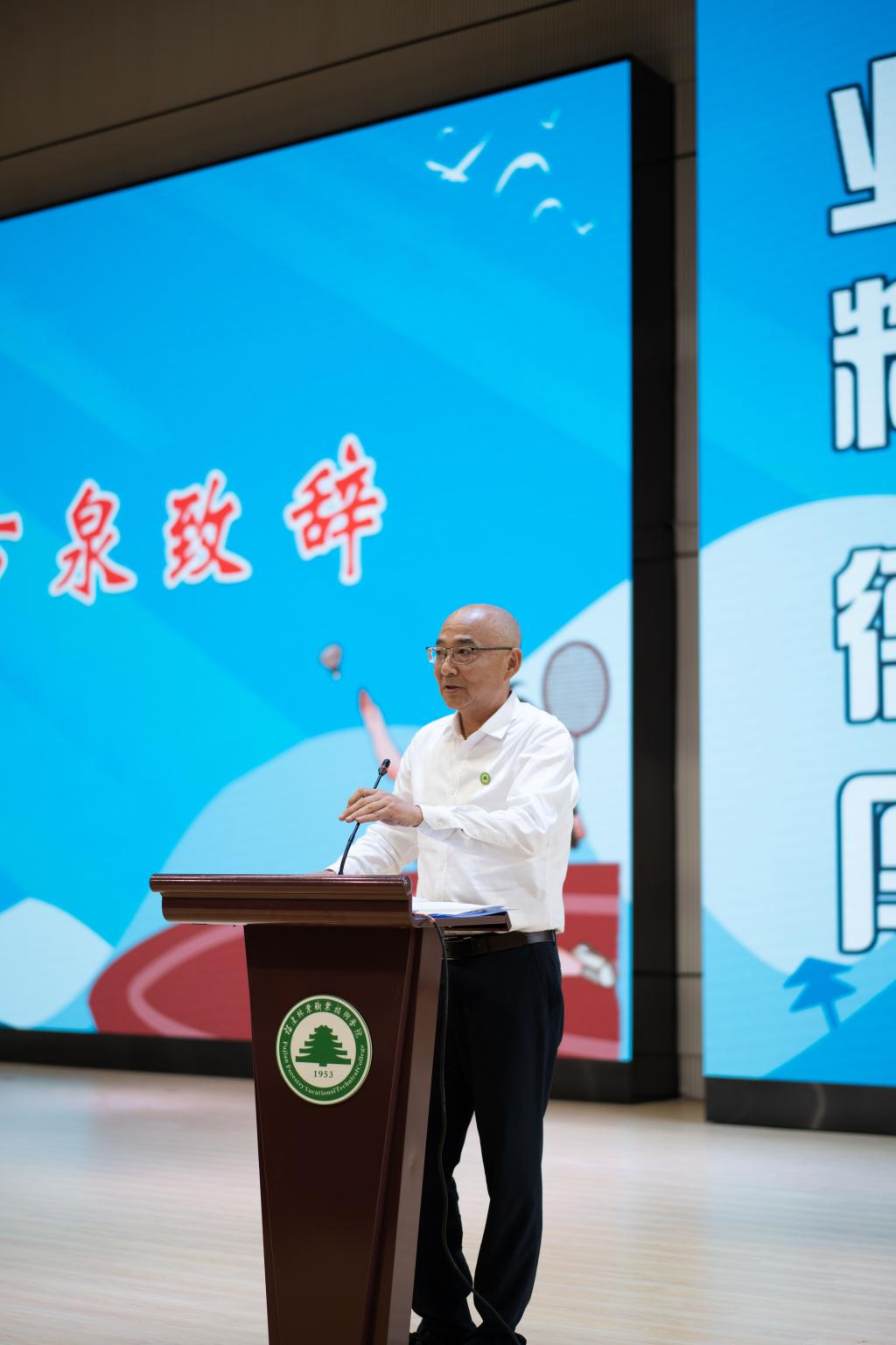 本网讯 福建省第十七届运动会将在南平市举行。从5月份开始,福建省第十七届运动会大学生部的比赛即将拉开帷幕。为了弘扬体育文化、传承体育精神、提升体育水平,激励同学们积极备战和参加省运会,2022年4月26日下午,福建省第十七届运动会福建林业职业技术学院体育代表团成立大会在学院江南校区体育馆举行。院党委书记万泉,院党委副书记、院长刘文开,院党委副书记严绍裕,副院长罗立仪出席成立大会。体育代表团领导小组成员,各系党总支书记及教师、教练员、运动员、学生代表共计300余人参加此次大会。会议由学院副院长李肇锋主持。