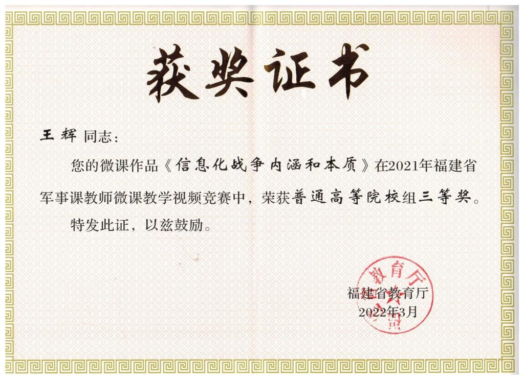 本网讯 近日,福建省教育厅公布2021年福建省军事课教师微课教学视频竞赛获奖名单。我院信息工程系王辉老师的参赛作品脱颖而出,荣获普通高等院校组三等奖。