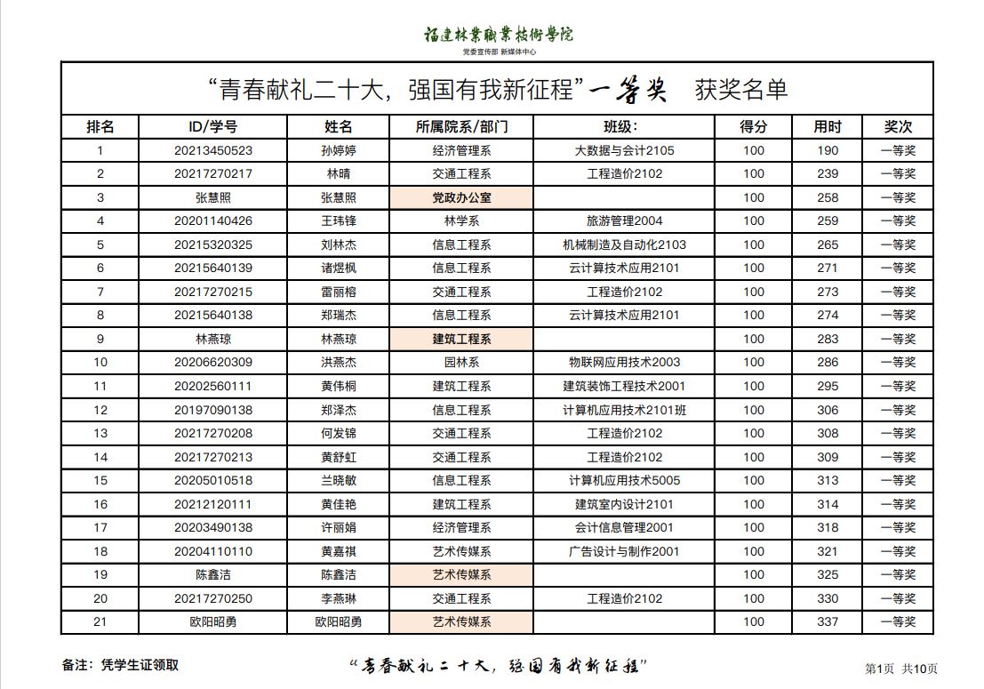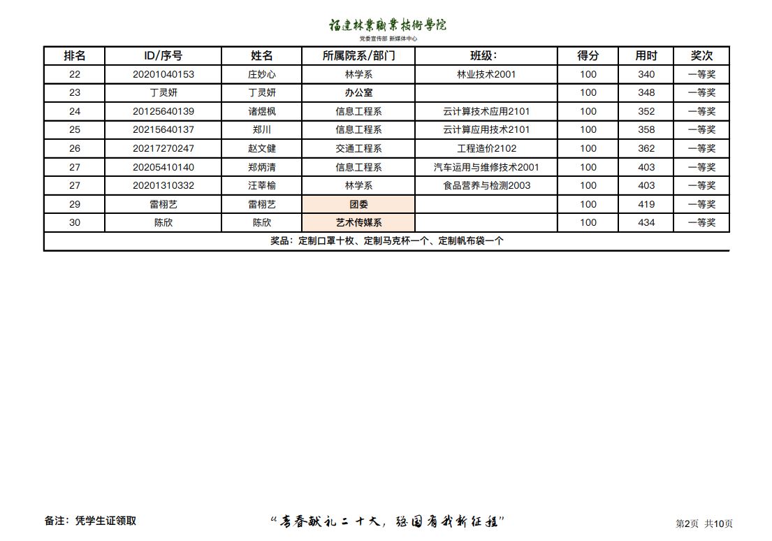 本次竞赛采用线上作答形式,竞赛试题重点突出、主题鲜明,重点考察师生对党史、新中国史、改革开放史和社会主义发展史知识以及校史校情等内容的学习理解、把握和综合运用水平。竞赛奖品是以林职院为主题设计的周边,深受广大师生的喜爱。
