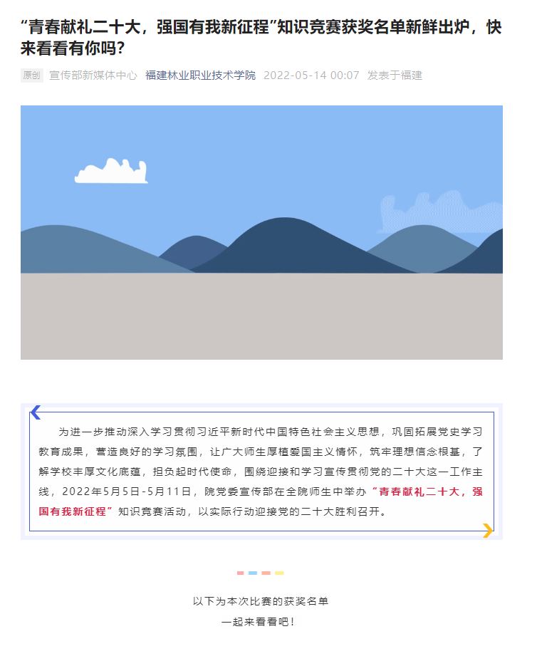 本网讯 为进一步推动深入学习贯彻习近平新时代中国特色社会主义思想,巩固拓展党史学习教育成果,营造良好的学习氛围,让广大师生厚植爱国主义情怀,筑牢理想信念根基,了解学校丰厚文化底蕴,担负起时代使命,围绕迎接和学习宣传贯彻党的二十大这一工作主线,2022年5月5日-5月11日,院党委宣传部在全院师生中举办“青春献礼二十大,强国有我新征程”知识竞赛活动,以实际行动迎接党的二十大胜利召开。