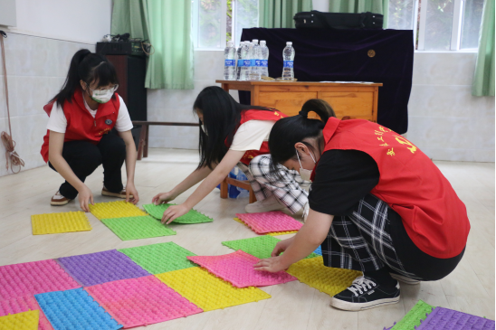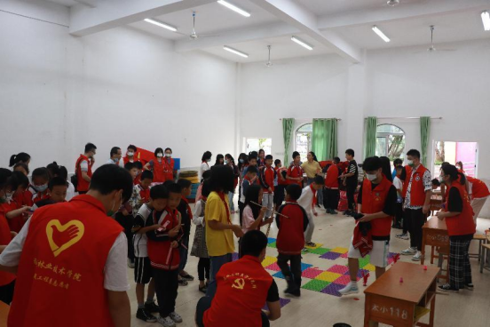 其余老师和志愿者们共同打扫学校学生活动场所并认真组织开展游戏互动。通过组织吹乒乓球、踢毽子、跳房子、投壶、套圈圈、螃蟹走等等游戏,孩子们快乐地参与其中,活动场所立刻变成了欢乐海洋。在玩游戏的过程中,孩子们体会到了团队合作的精神,更收获了快乐和新的友谊。参与游戏的孩子们感谢志愿者们的付出,并表示自己会刻苦学习,学好本领,将来回报社会,将这份爱心传递下去。看着孩子们灿烂的笑容,志愿者们心里感到十分开心。游戏过后,志愿者们主动亲近孩子,与他们细心交流,关心询问他们的学习、生活和健康情况。