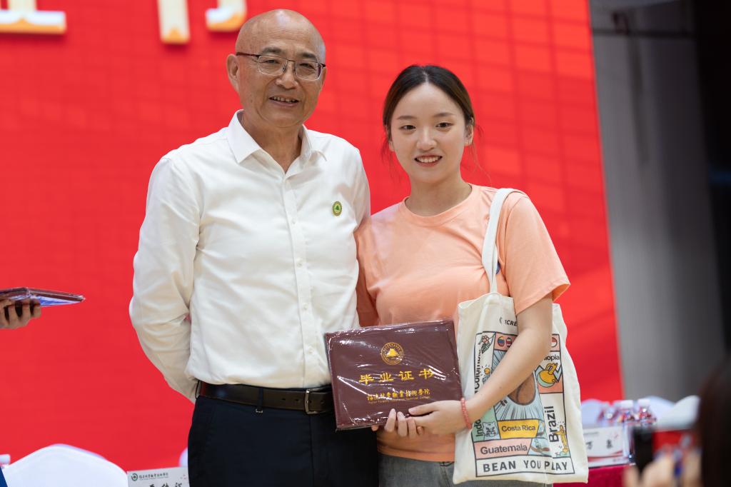 ▲万泉书记和刘文开院长毕业生代表颁发毕业证书