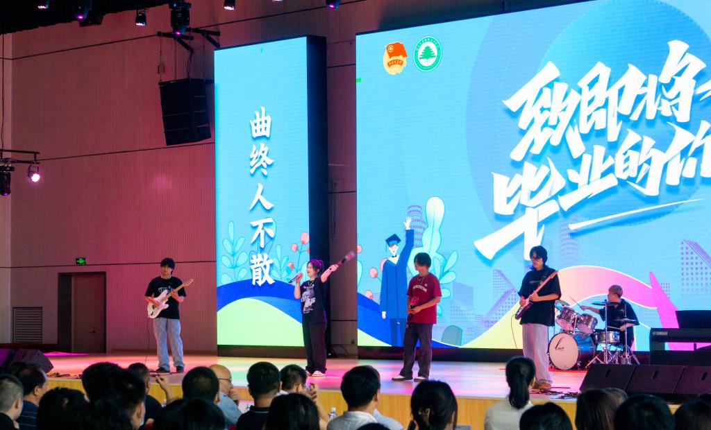 毕业典礼正式开始前,举行了“曲终人不散,艺起向未来”毕业汇演。千岛寒流乐队以歌抒情,带上他们的祝福唱响《海阔天空》。歌曲《你曾是少年》、配乐朗诵《毕业诗》、舞台剧《我的青春》、温馨感人的毕业季视频……把毕业生的思绪拉回到三年前那场和林职院的邂逅以及大学三年的精彩瞬间。学院新拍的林职院版MV《领航》让毕业生看到学院在党委的领航下的发展越来越好。“我们都需要爱,大家把手都牵起来,Together for a shared future,一起来一起向未来。”青春活力的歌曲响起,让毕业生对未来多了几分憧憬,他们在学院的美好祝愿中即将开启属于自己的未来。《千里之外》《see you again》熟悉的旋律、饱含深情的歌声在耳边响起,更是点燃全场气氛,唱出了2022届毕业生们对母校的深深眷恋。
