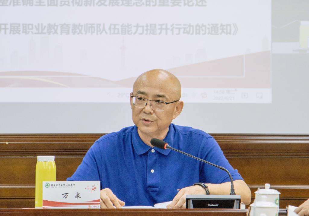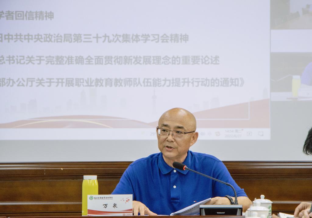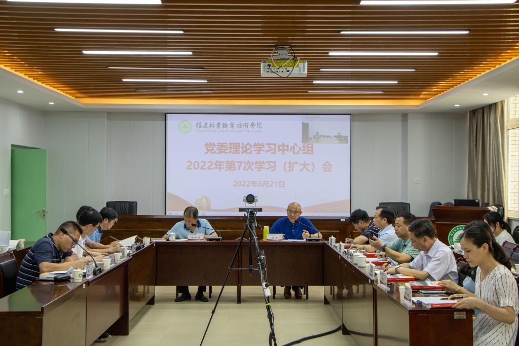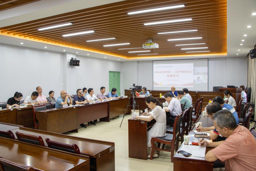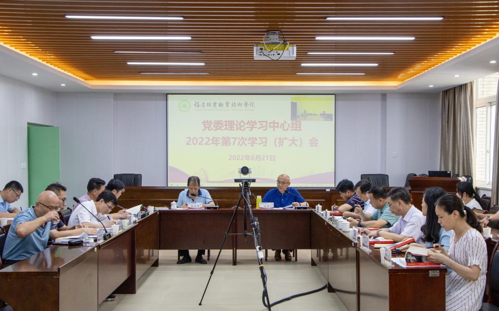 本网讯 2022年6月21日下午,院党委书记万泉主持召开2022年第7次党委理论学习中心组学习(扩大)会议。会议集中传达学习了习近平总书记在四川考察时重要讲话精神、习近平总书记致2022年六五环境日国家主场活动的贺信精神、习近平总书记给南京大学留学归国青年学者回信精神、中共中央政治局第三十九次集体学习会精神、习近平总书记关于完整准确全面贯彻新发展理念的重要论述以及《教育部办公厅关于开展职业教育教师队伍能力提升行动的通知》等内容,并开展《闽山闽水物华新——习近平福建足迹》专题研讨。院党委委员、各系党总支书记、机关处室党支部书记参加了会议。