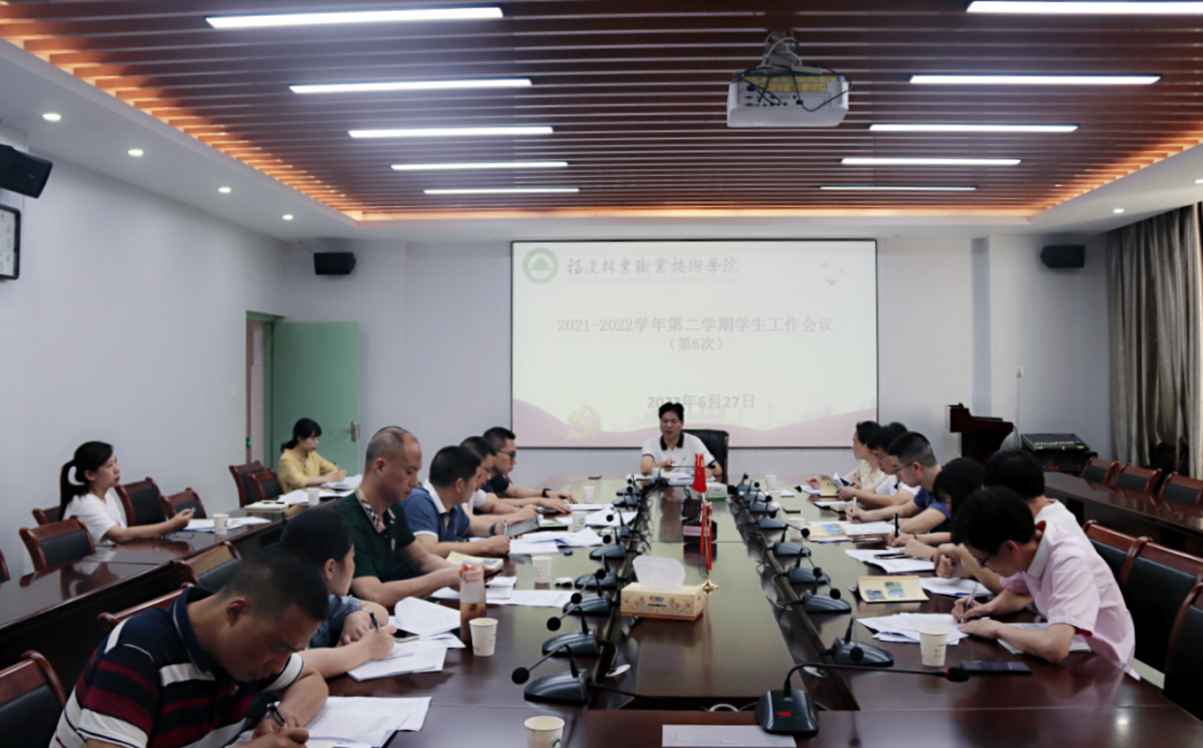 本网讯 6月27日下午,我院在江南校区办公楼五层会议室召开2021-2022学年第二学期第6次学生工作会议,部署期末学生工作。党委副书记严绍裕出席会议并讲话,学生工作部、安全保卫处、团委等部门负责人,各系党总支书记参加了会议。