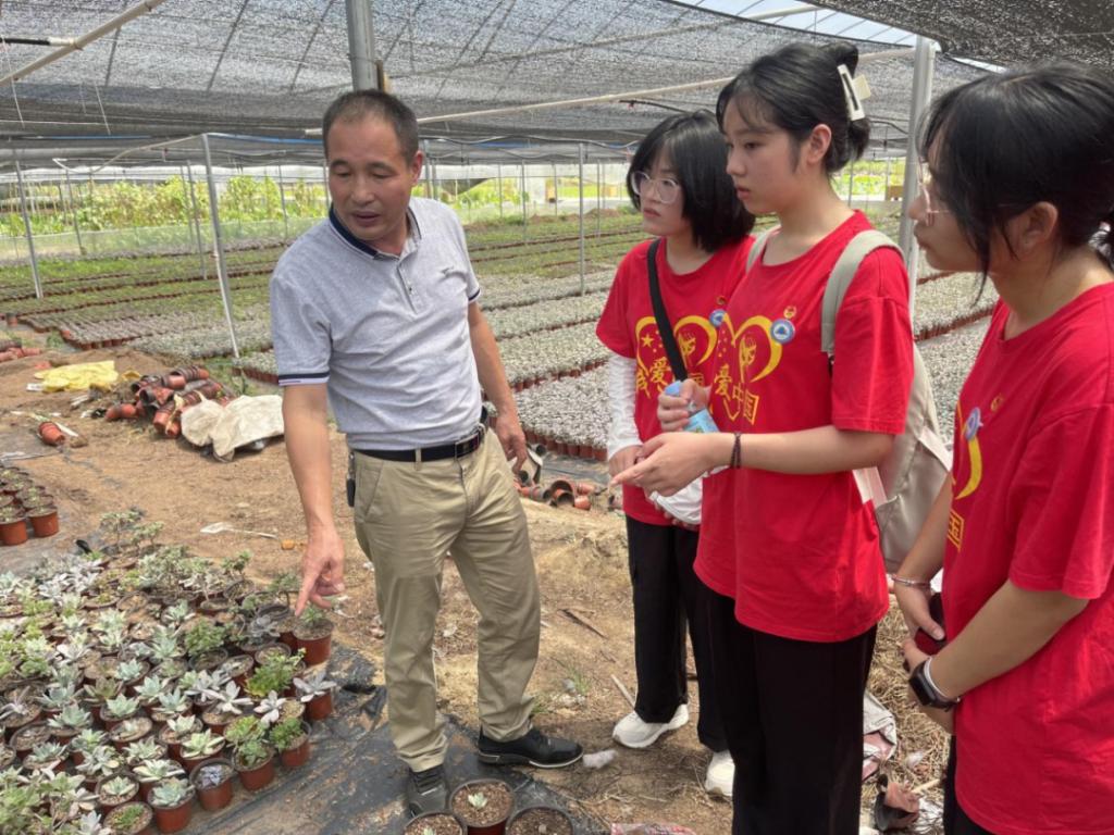 实践队员们跟随基地负责人林武云来到多肉种植大棚,基地负责人向队员们分享了多肉种植与养护经验。对于目前基地使用中药渣按一定比例进行营养土调配培育多肉幼苗,队员们建议还可以使用椰土这种经济环保材料。
