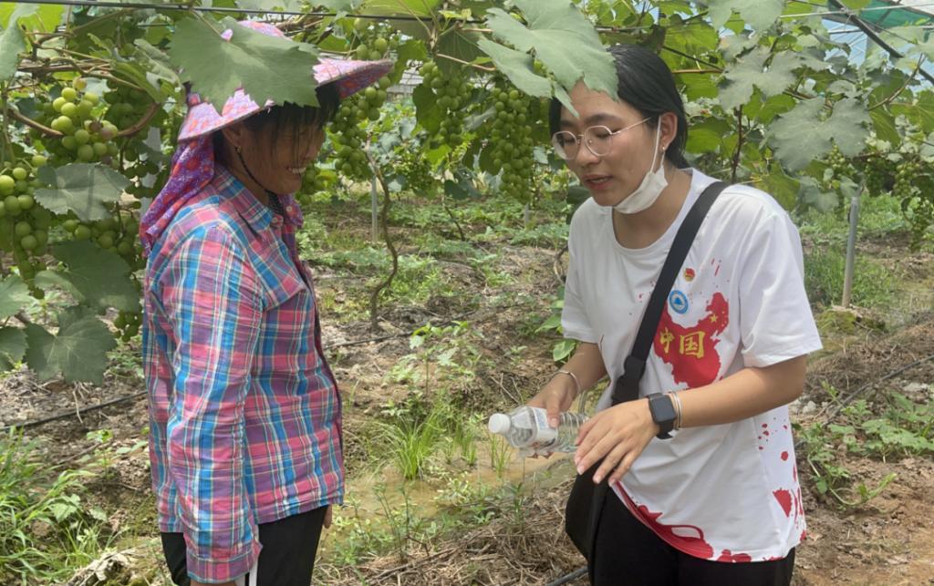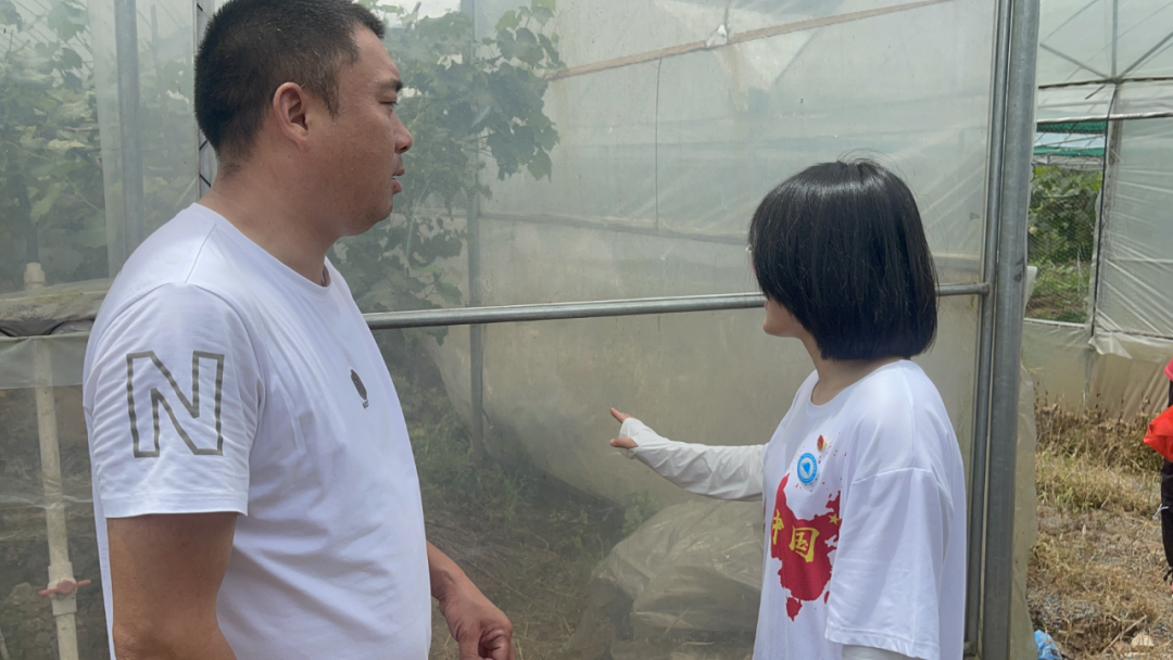 实践队员走访宁化县国贞生态农业有限公司的葡萄和西瓜种植大棚。通过实地考察,了解到大棚葡萄上色不均匀的情况,实践队给出几点建议:安装果穗光路灯;在葡萄树生长后期加大钾肥的施用量,适当控制浇水量;花开后20天左右就开始疏穗工作,摘除老叶和覆盖反光膜。