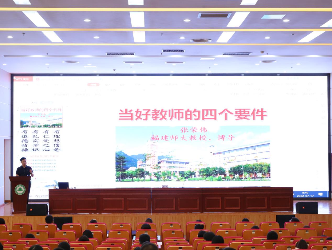 7月17日上午,福建师范大学张荣伟教授总结“当好教师的四个要件”:教育理想是教师职业的内在动力;教育激情是教师职业的精神风貌;教育智慧是教师职业的创新之本;教育良知是教师职业的道德底线。