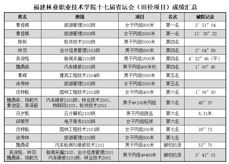 本次比赛由我院艺术传媒系体育教研室廖士喜、乐丽燕、洪虹、邱月琴四位老师率队参加,主要参与中长跑、短跑、跳远、投掷四个大项。我院15名运动员,经过激烈的角逐,喜获2枚金牌、14项前八名单项奖的好成绩,并刷新我院10项田径记录!