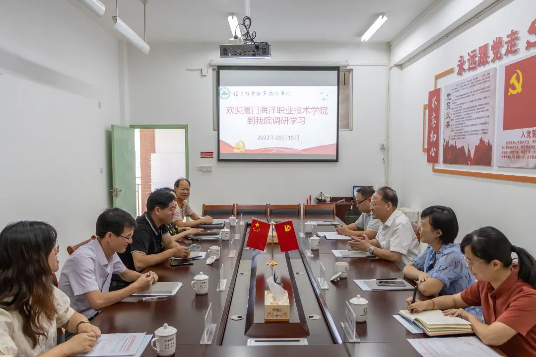 本网讯 为落实立德树人根本任务,构建全员育人、全过程育人、全方位育人格局,不断加强校际间“三全育人”工作相互学习、相互促进,9月15日下午,厦门海洋职业技术学院党委委员、副院长马国玄,党委委员、宣传部部长林秀芬等一行4人莅临我院开展“三全育人”工作交流。交流学习以座谈交流、实地参观等形式开展。