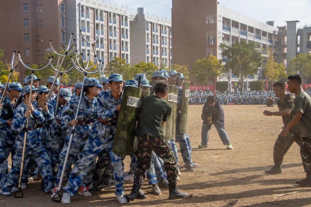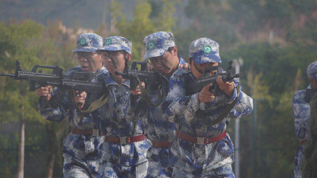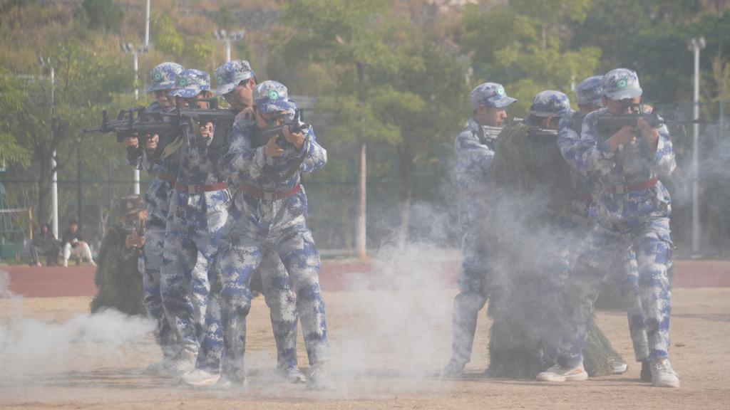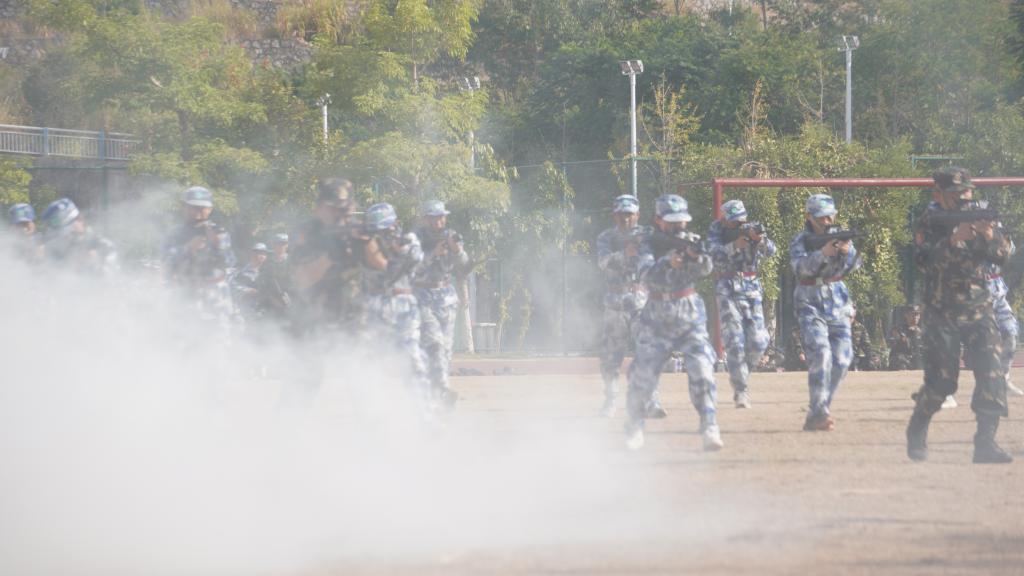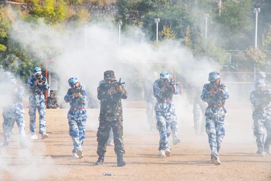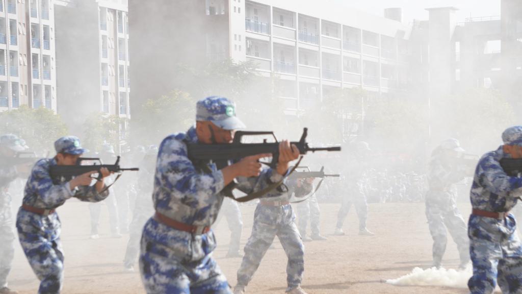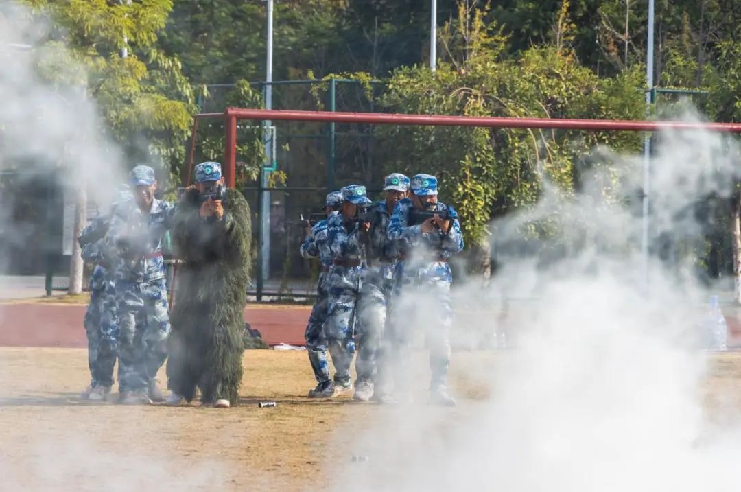 瞄准射击、侦查抓捕、散打拳击。吹过的风,淋过的雨,晒过的太阳,流过的汗水全都汇成军训汇演时无穷的力量。