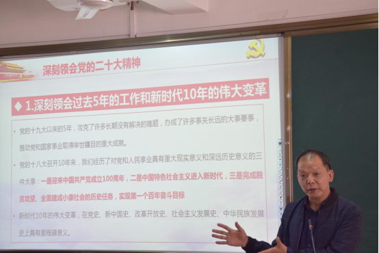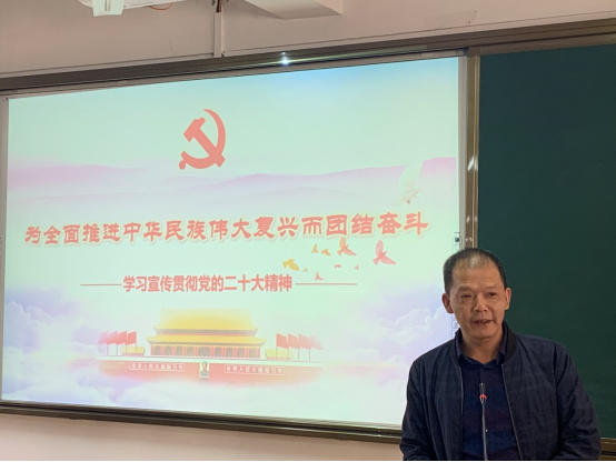 本网讯 为深入学习贯彻党的二十大精神,11月8日下午,院长刘文开教授深入经济管理系作题为《为全面推进中华民族伟大复兴而团结奋斗——学习宣传贯彻党的二十大精神》的专题辅导报告。报告会由经济管理系党总支书记谢福荣主持。全系教师及学生党员代表参加本次报告会。