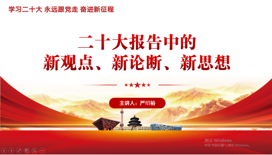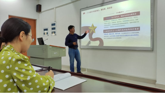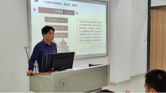 党课上,严副书记简要梳理了二十大报告中的新观点、新论断、新思想,主要围绕“大会主题”“三个务必”“十年来三件大事”“党的中心任务”“中国式现代化”“五个必由之路”等具体内容展开论述。他表示,党的二十大是在全党全国各族人民迈上全面建设社会主义现代化国家新征程、向第二个百年奋斗目标进军关键时刻召开的一次十分重要的大会。党的二十大全面总结了过去5年工作和新时代10年的伟大变革,系统阐述了新时代坚持和发展中国特色社会主义理论和实践问题,科学谋划了未来一个时期党和国家事业发展的目标任务和大政方针,是团结动员全党全国各族人民全面建设社会主义现代化国家、全面推进中华民族伟大复兴的政治宣言和行动纲领。他强调,我们应该积极响应党的号召,高举中国特色社会主义伟大旗帜,全面贯彻习近平新时代中国特色社会主义思想,弘扬伟大建党精神,自信自强、守正创新,踔厉奋发、勇毅前行,为全面建设社会主义现代化国家、全面推进中华民族伟大复兴而团结奋斗。
