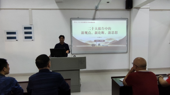 本网讯 为进一步学习宣传党的二十大精神,2022年11月10日下午,院党委副书记严绍裕为建筑工程系师生党员和联系班级学生讲授主题为“二十大报告中的新观点、新论断、新思想”专题辅导党课,旨在引领广大师生党员和青年学生更好地学习党的二十大精神,进一步提高政治素质、理论修养和业务能力,推动各项工作干在实处、走在前列,更好地开创未来。