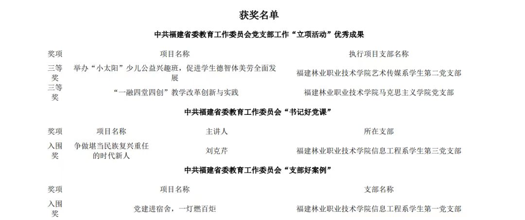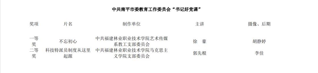 本网讯 我院6个项目入选全省、全市高校党支部工作“立项活动”优秀成果和“党员好故事、书记好党课、支部好案例”近日,中共福建省委教育工作委员会印发《关于公布高校党支部工作“立项活动”优秀成果和“党员好故事、书记好党课、支部好案例”获奖名单的通知》(闽委教组〔2022〕26号),我院获党支部工作“立项活动”优秀成果三等奖2项,“书记好党课”“支部好案例”各1项。据《关于公布“书记好党课”评选活动》(南委教办〔2022〕5号)悉,在中共南平市委教育工作委员会主办的书记好党课”评选活动中,我院获“书记好党课”一等奖、二等奖各1项。