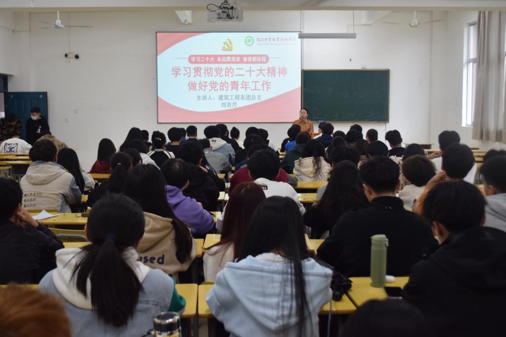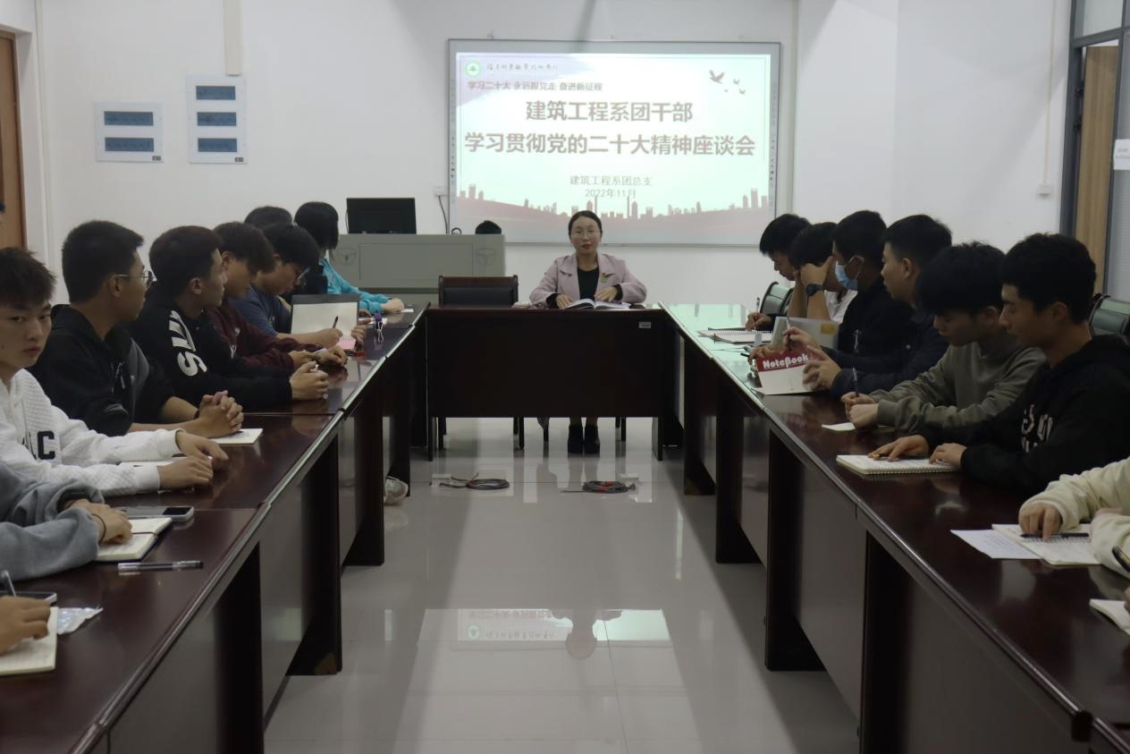 建筑工程系团总支在院党委、团委和系党总支的领导下,高度重视学习宣传党的二十大精神,为带领系部青年进一步领会党的青年工作的战略性要求和深刻内涵,用党的科学理论武装青年,用党的初心使命感召青年,2022年11月15日,建筑工程系学生科科长兼团总支书记刘克芹老师在教学楼为系学生干部作题为《学习贯彻党的二十大精神 做好党的青年工作》专题团课,领学党的二十大精神。