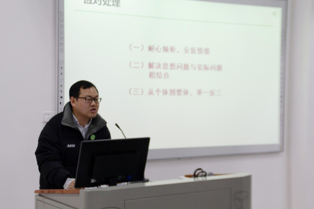 最后,严绍裕副书记对开展心理危机干预工作提出三点建议。一是动态开展心理摸排,确保底数清晰。一方面,要形成“专业心理老师—系部学工队伍—班级心理委员/班干部—学生宿舍舍长”为主的四级联动体系,解决谁来摸排的问题;另一方面,针对怎么摸排的问题,一要加强自查,在摸排中鼓励学生通过心理量表进行定期自我评估,对自身心理状况进行自检自查;二要关注学生日常学业情况、寝室关系、人际关系、家庭亲子关系等,观察、了解学生的实时心态状况,同时开展家校联动,实现“辅导员—班干部—舍长—家长亲属”协同;三要全面评估,对自查与日常观察中掌握的信息、发现的问题进行综合分析、研判分类。二是分类开展疏导干预,确保对症下药。要分析找出导致心理问题的原因,再分类施策、对症下药;要倡导一线工作法,用心用情关心关爱问题学生,解决学生的心理问题与解决学生的实际问题相结合。三是精准实施重症管理,确保安全稳定。健全和落实“学院—学工部—系部—学生骨干”四级责任体系