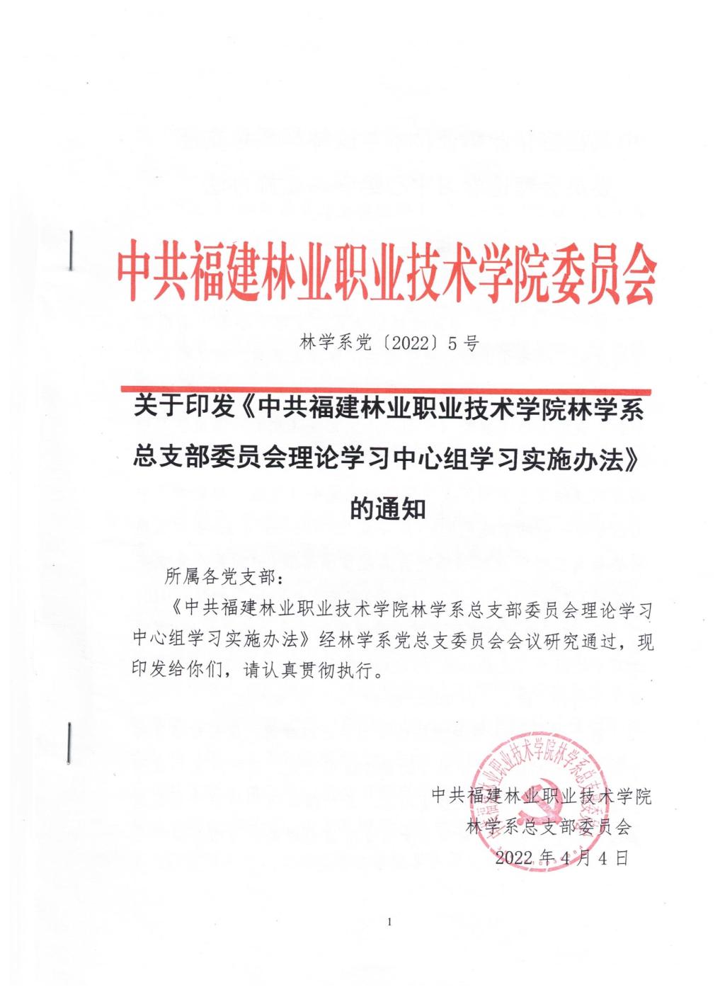 (四)建设一个制度:理论学习中心组学习是系部领导班子开展政治学习的重要方式,是增强领导班子政治意识的可靠载体。因此,林学系党总支特制定《中共福建林业职业技术学院林学系总支部委员会理论学习中心组学习实施办法》(林学系党〔2022〕5号),以提升系部领导班子的战略高度。