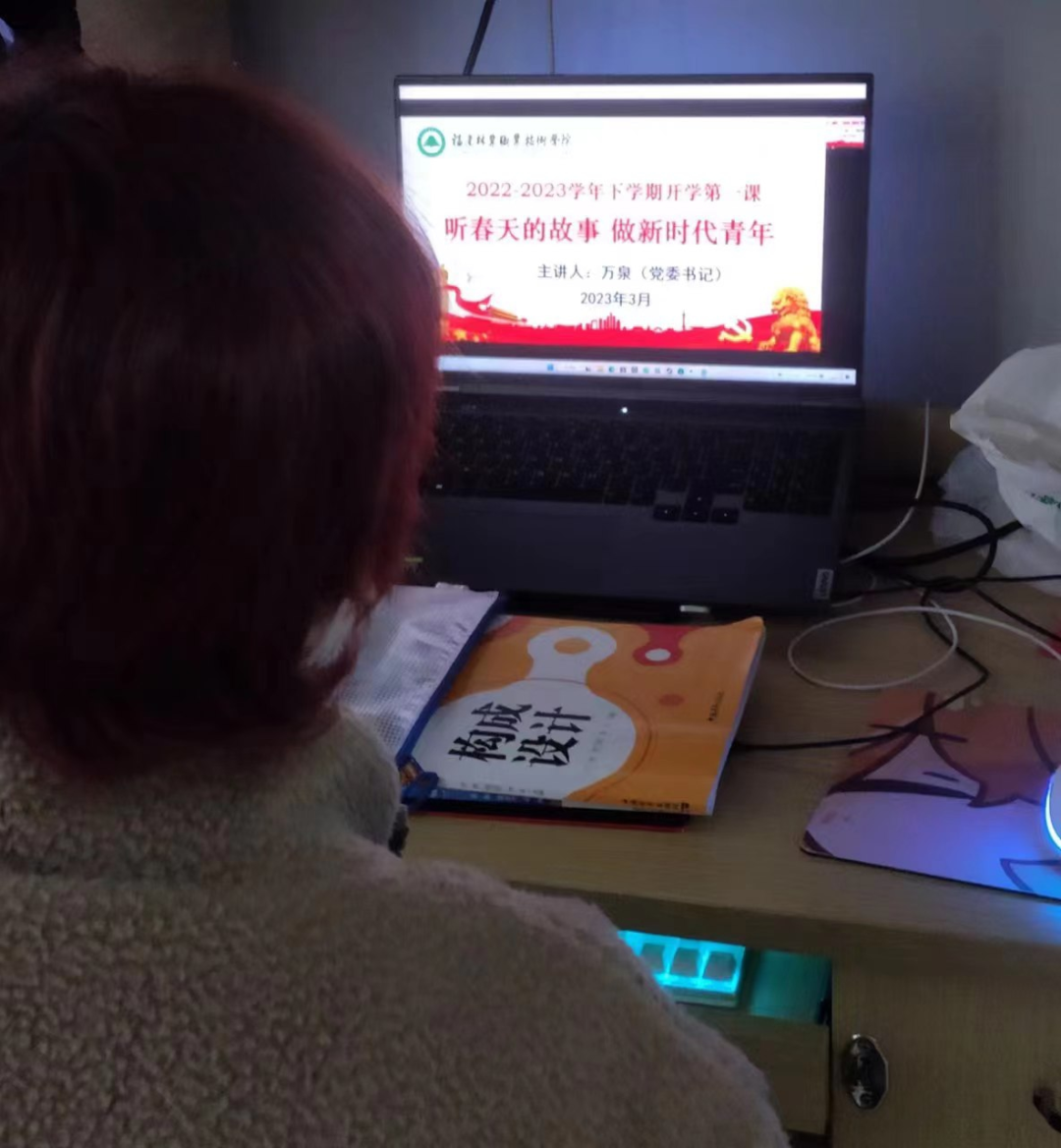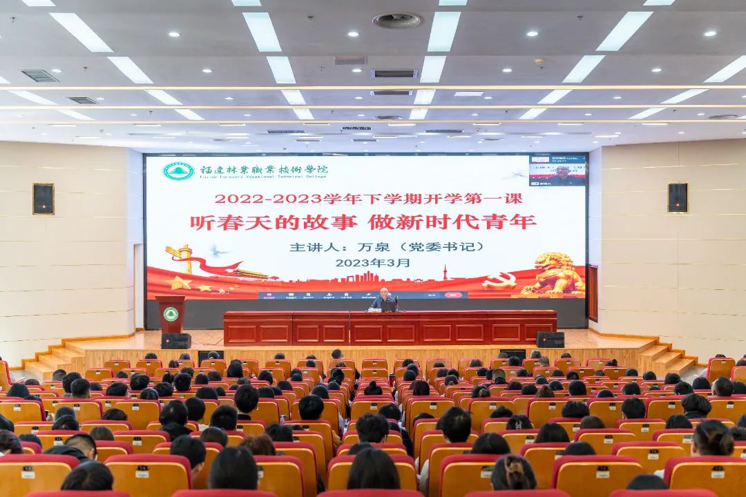 本网讯 为深入学习贯彻党的二十大精神,落实省委省政府“深学争优、敢为争先、实干争效”行动部署,引导全院师生自信自强守正创新,续写新时代青年故事,3月14日下午,福建林业职业技术学院采用“线下讲座+线上直播”的形式开展2023年春季学期“开学第一课”,学院党委书记万泉以《听春天的故事 做新时代青年》为题,为全院师生讲授专题思政课。