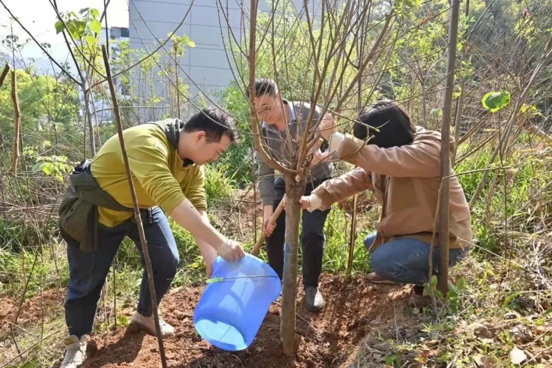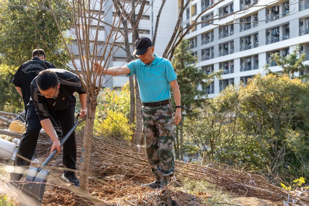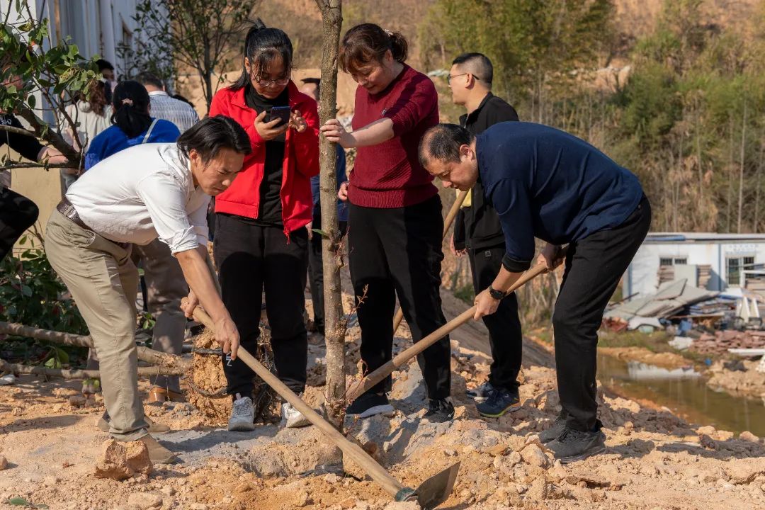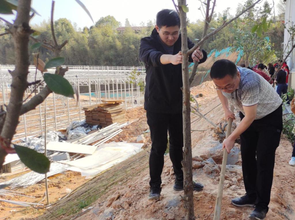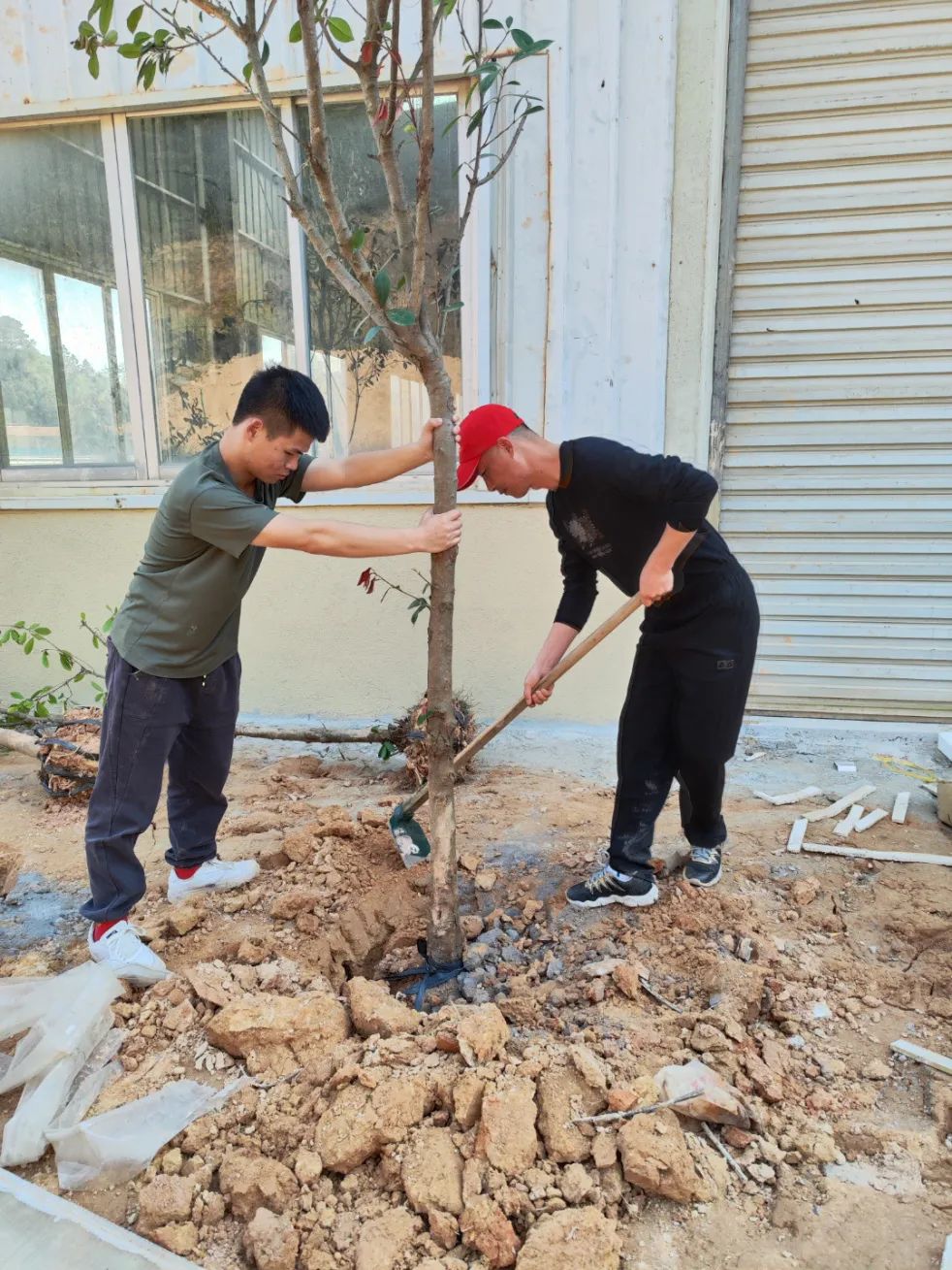 仪式结束后,师生来到“龙景山大学生劳动教育实践基地”开展2023年校园植树主题党团日活动。植树现场,师生们干劲十足,配合默契。大家将一棵棵树苗植入新坑,挥锹铲土,扶正苗木,培土踩实,围堰浇水,为校园增添绿色,用自己的双手为学院播种绿意,用自己的行动和汗水充分展现了林职院师生的良好风貌与责任担当。