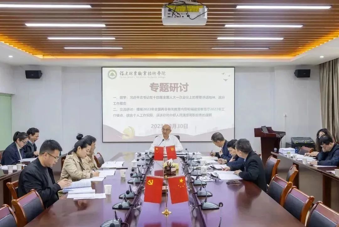 本网讯 2023年3月30日下午,院党委书记万泉主持召开2023年第3次党委理论学习中心组学习(扩大)会议,专题研讨全国两会精神。会议传达了习近平总书记在十四届全国人民代表大会第一次会议上的重要讲话精神和政府工作报告。与会人员根据2023年全国两会有关教育内容和福建省教育厅2023年工作要点,结合个人工作实际,就办好人民满意教育开展专题研讨。