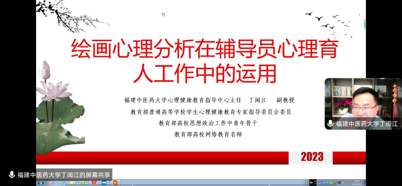 本网讯 为切实增强我院辅导员心理健康教育工作的专业性和科学性,进一步提升我院辅导员的师德素养和心理育人能力,加强辅导员队伍专业化建设,深刻理解并改善学生心理健康状况,2023年5月12日学生工作部特邀福建中医药大学大学生心理健康教育指导中心主任丁闽江副教授开展《绘画心理分析在辅导员心理育人工作中的运用》主题讲座。讲座由学生工作部部长蔡敏主持,各系党总支书记、副书记、全体专职辅导员和心理健康教师参加。