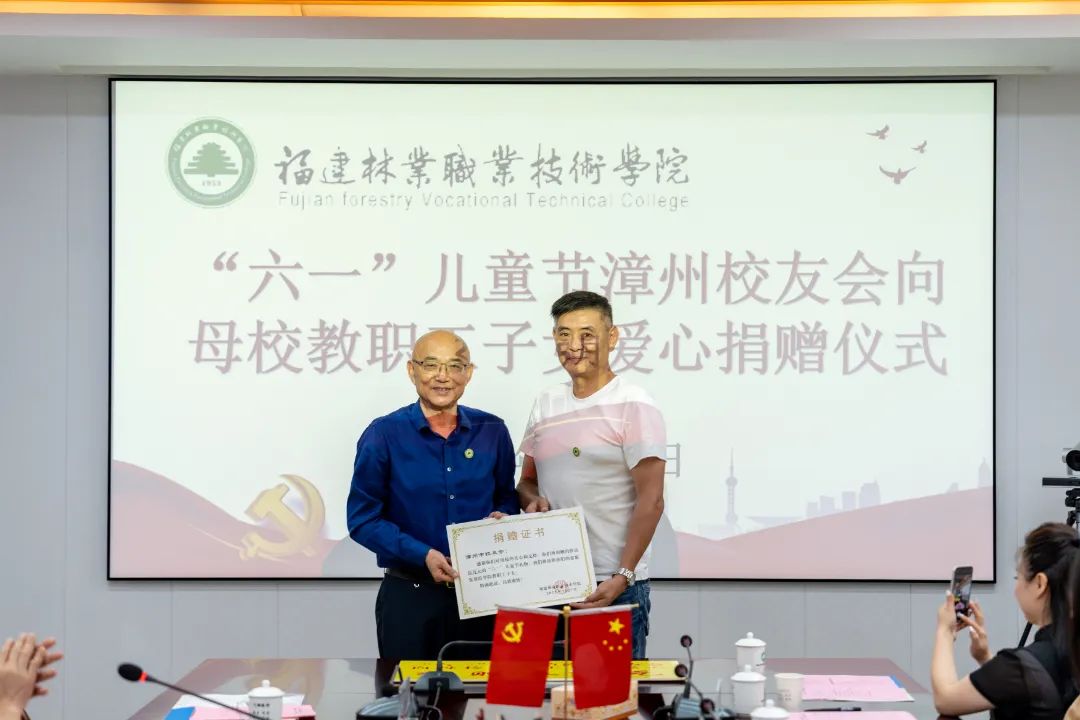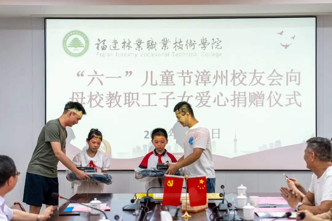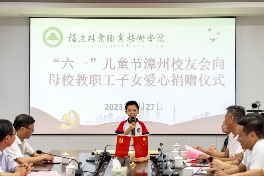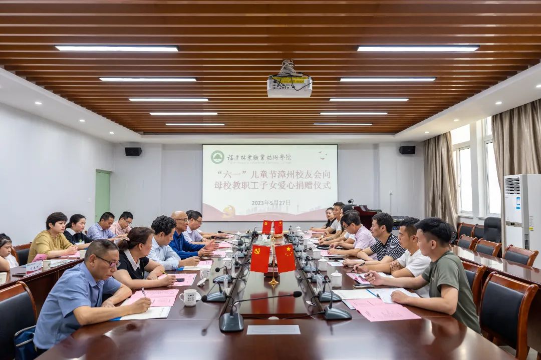 本网讯5月27日下午,学院于行政楼5楼会议室举行漳州校友会“六一”儿童节捐赠仪式暨校友企业家返校座谈会,致谢关心教职工子女的广大校友,携手校友企业共同谋划学院发展的美好蓝图。学院党委书记万泉、副院长李肇锋、党政办公室主任廖世建、人事教育处处长黄丽霞、工会常务副主席张毅、艺术传媒系党总支书记陈政、信息工程系党总支副书记(主持工作)叶文美以及相关工作人员、教职工代表、儿童代表参加本次活动。漳州校友会执行会长兼执行秘书长林结顺、常务副会长张提顺、常务副会长林丕忠、常务副会长郑毅群、常务理事林明安、常务理事陈志鹏、秘书处郭艺敏等校友参加活动。活动由学院副院长李肇锋主持。
