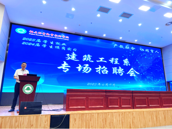 本网讯 为贯彻落实党中央、国务院“稳就业、保就业”重大决策部署,深化产教融合,实现校企“人才共育”,探索建立校企深度合作、双向参与、双向服务、双向受益的可持续育人机制,推进系部学生更好实习与就业,6月9日晚,建筑工程系邀请7家校企合作企业举办2023届未就业学生及2024届毕业生顶岗实习专场招聘会。学院党委书记万泉、党委副书记严绍裕、建筑工程系党政领导班子、毕业班专职辅导员及我系2023届未就业学生和2024届毕业生共同参加本次企业宣讲推介会暨专场招聘会。本次招聘会由建筑工程系主任彭忠伟主持。