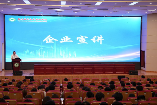 院党委书记万泉发表讲话。他对今天到场宣讲的7家校企合作企业表示热烈的欢迎和由衷的感谢。针对当前的就业形势,他对即将走向社会的同学们提出三点要求:一是要树立正确的就业观,尽可能尽快工作,自食其力。二是要发扬吃苦耐劳的工匠精神,从最基层做起。三是要不断学习、勇于实践,提升自己的工作能力。他预祝同学们能够找到如意的岗位,从点滴开始,久久为功,实现自己的人生价值。