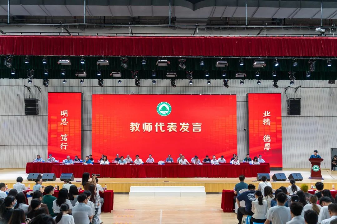 “毕业如期而至,未来就在脚下。今天,我们相聚在雄伟壮观、全省一流的江南体育馆,共同见证2023届6843名同学硕果累累的毕业季和人生旅途的新征程。”院党委副书记、院长刘文开在致辞中代表学院向2023届毕业生表示热烈祝贺。“我希望你们铭记“敬业、吃苦、务实、进取”的天麟精神和“明思、笃行、业精、德厚”的校训,并成为伴随你们一生的精神财富!”刘文开院长对毕业生们提出殷切希望,“一要永葆家国情怀。砥砺奋斗梦想,主动将自己的人生际遇与国家民族的命运前途紧密相连,用实际行动诠释青年的责任担当,践行校歌中唱到的:“我们是绿色希望使者,建设家园装点河山,我们是七彩生命之光,自强不息成就梦想”,在爱国奉献中实现个人价值;二要崇尚奋斗精神。还在择业阶段的毕业生,要认清就业形势的严峻性,坚持先就业后择业,积极参加学院大型招聘会。已经就业的毕业生,要坚持干一行精一行,把学到的知识和技能运用到实践中去,持之以恒地坚持下去,小白也可能成为专家;三要常怀感恩之心。要感恩父母的养育,要感恩老师的教诲,要感恩同学的帮助,感恩生命里,别人对自己的每一次帮助;感恩岁月里,每一份温暖的记忆。