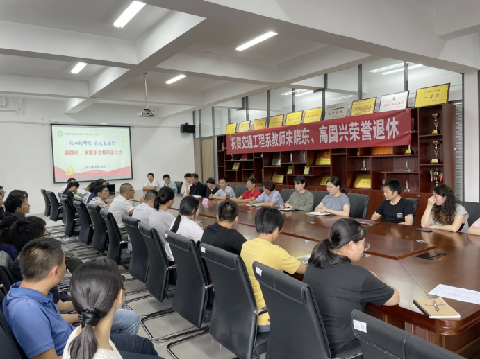 本网讯 目之所及皆为回忆,心之所向皆是过往。为进一步弘扬尊师重教良好风尚,发挥老教师的榜样示范和引领作用,激励更多青年教师献身教育事业,6月29日,交通工程系隆重举行高国兴和宋晓东老师荣退仪式。学院党委委员、副院长谢金生、系党总支书记陈莉、主任孙华、副主任李林威、专职组织员黄雪媛、教务科科长陈毅勇、系学生科科长兼团总支书记李建文及全体教师参加活动,仪式由副主任李林威主持。