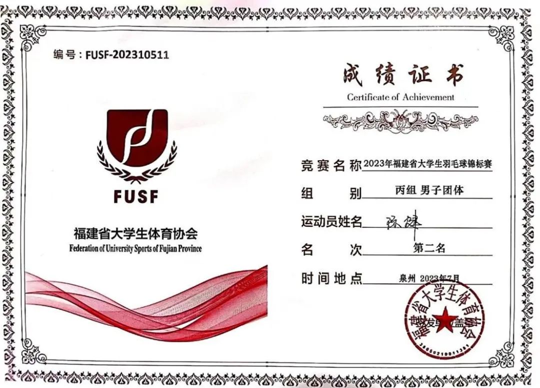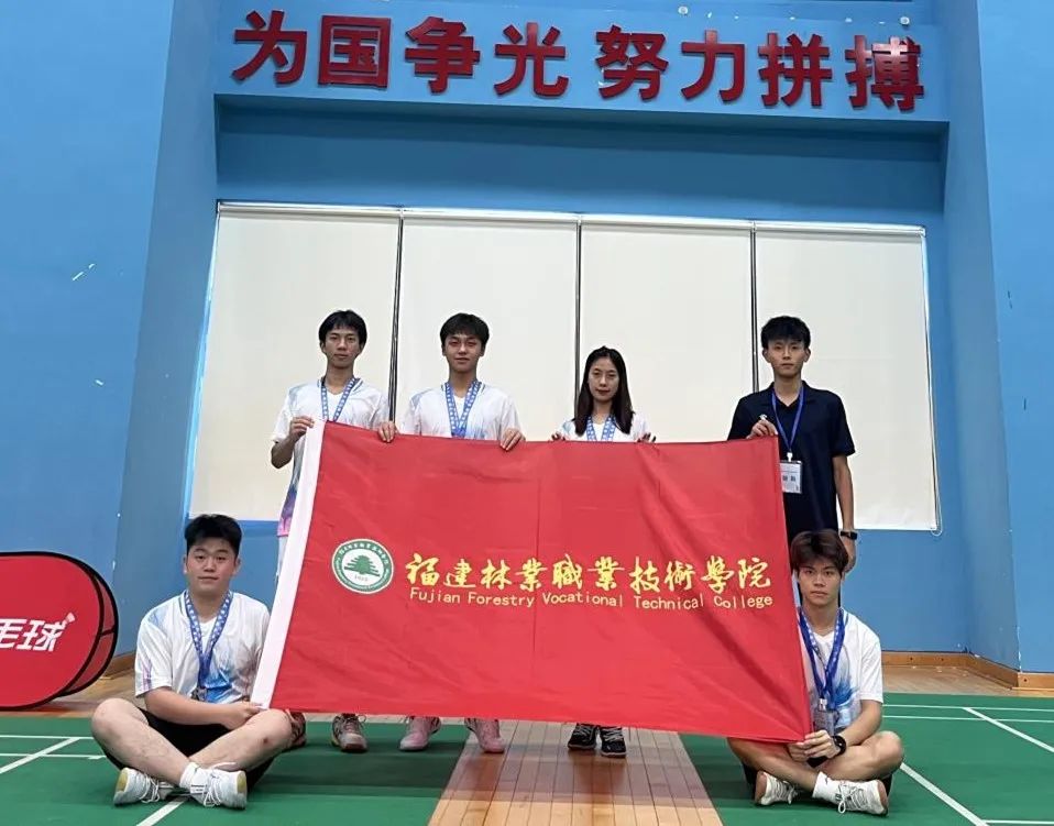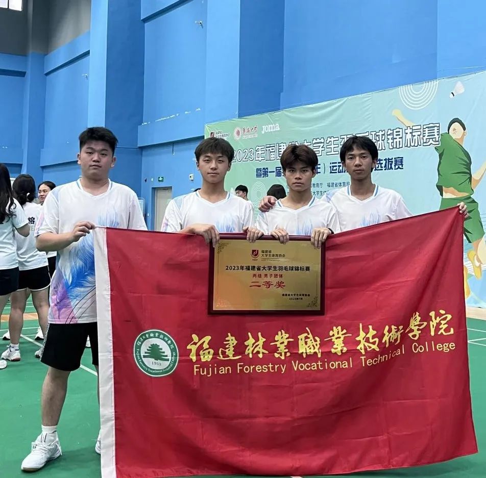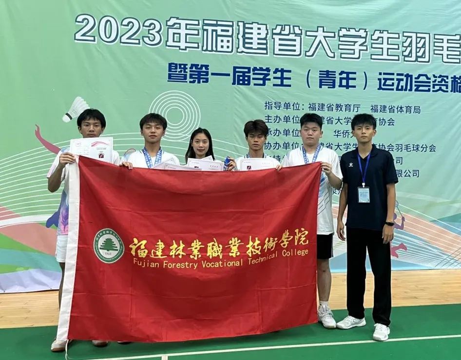 本网讯2023年福建省大学生羽毛球锦标赛于7月10日在泉州华侨大学拉开序幕。我院公共教学基础部体育教研室郑泽宗老师带领我院代表队陈健、王珂、林道城、葛少明、郭坤林5位同学经过5天的激烈角逐,一路披荆斩棘,奋勇拼搏,获得男子团体第二名,男子双打第二名,男女混合双打第三名,女子单打第四名,男子双打第六名,男子单打第七名的好成绩!