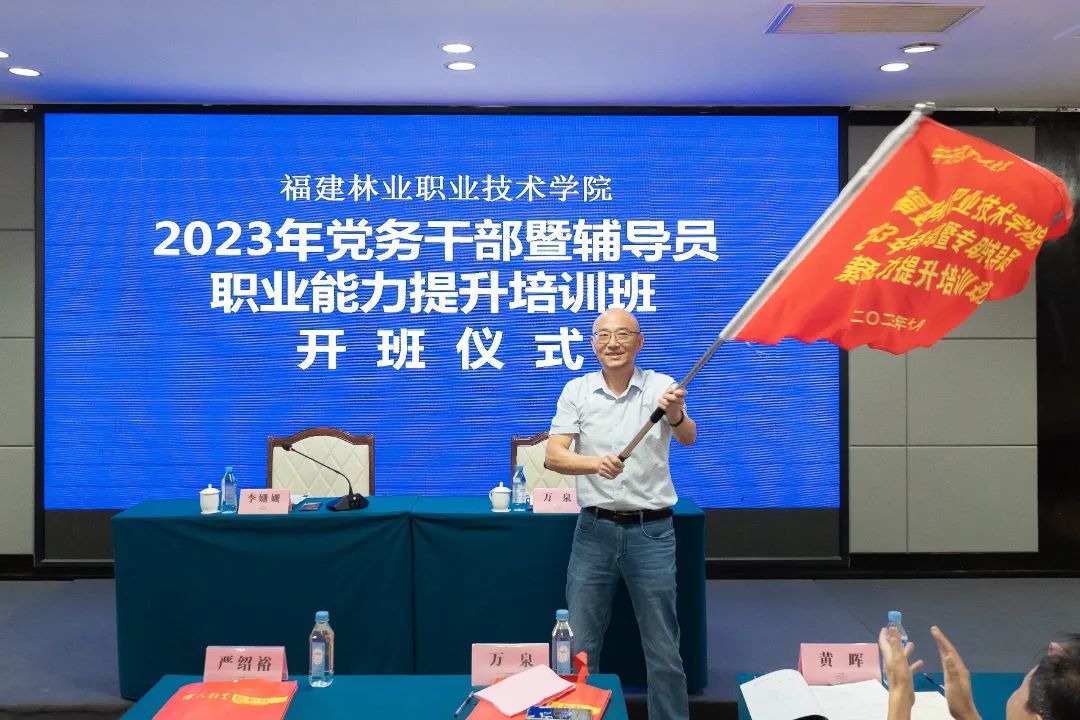 本网讯为深入开展学习贯彻习近平新时代中国特色社会主义思想主题教育,进一步提高学院党员干部和专职辅导员的政治理论修养和党建工作水平,促进学院党建与业务深度融合,2023年7月18日,福建林业职业技术学院2023年党务干部暨专职辅导员素质能力提升培训班在中共湘潭市委党校顺利开班。院党委书记万泉出席开班仪式并作动员讲话。湘潭市委党校副校长、副教授李姗姗致欢迎辞,并为培训班授旗。开班仪式在庄严的国歌声中拉开帷幕。