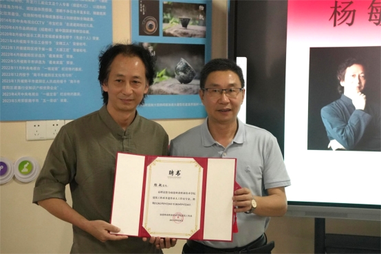 随后,李肇锋副院长向非物质文化遗产建盏传承人杨敏先生颁发建筑工程系非遗传承人工作室专家聘书。