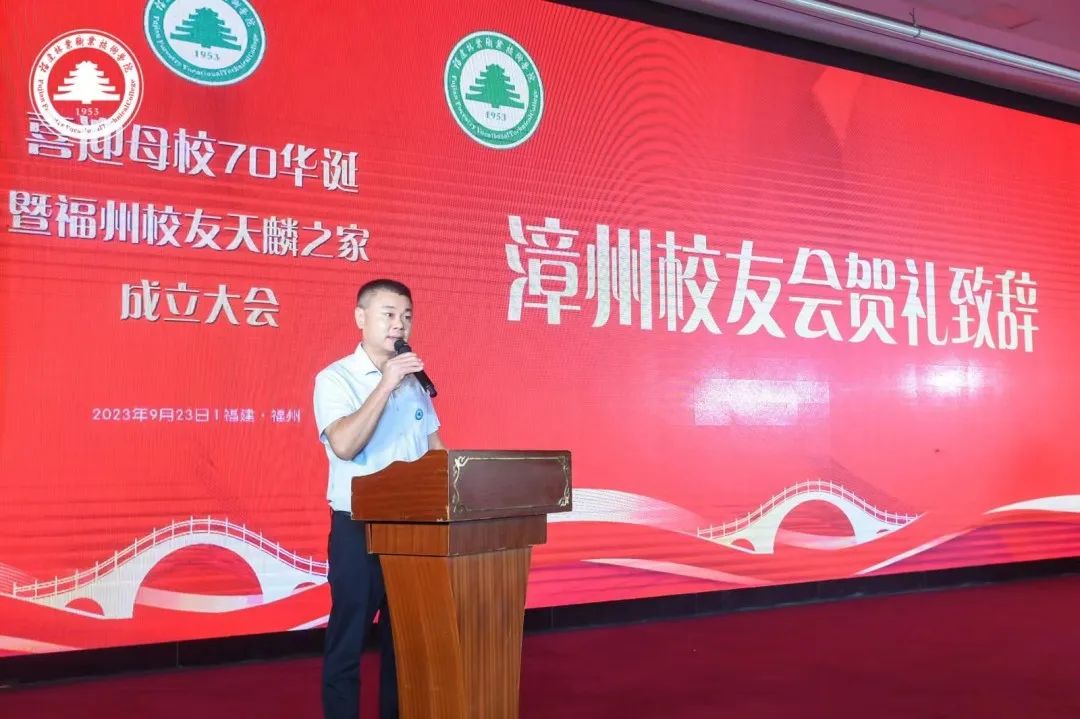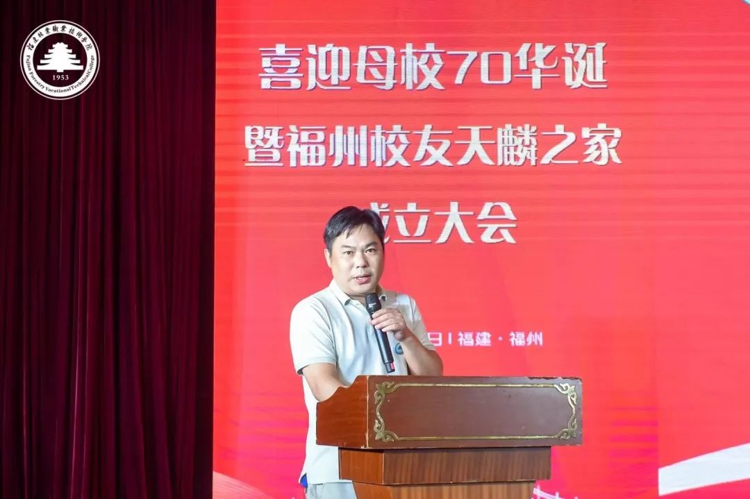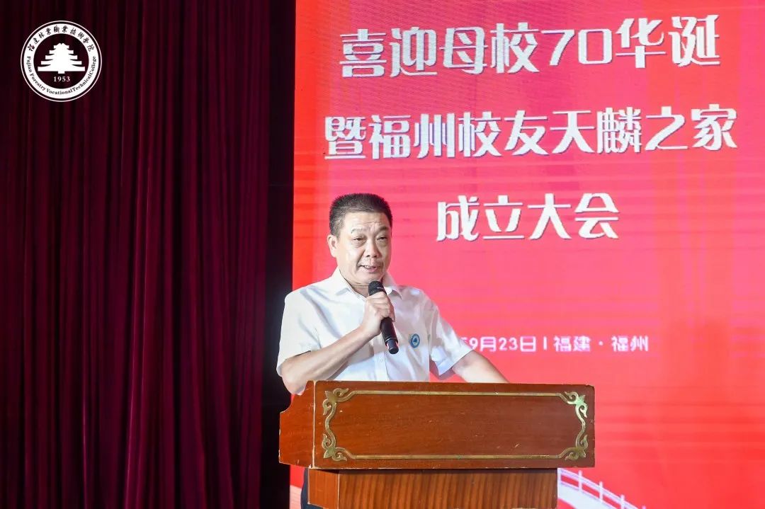 学院院长刘文开代表母校致辞。他对福州校友天麟之家的成立表示祝贺,向长期以来支持、关心学院建设发展的各位校友致以诚挚的问候,同时回顾了学校办学70年以来的发展与取得的成就。他指出,校友是学校得天独厚的宝贵财富,是学校取之不尽,用之不竭的力量源泉,学院的发展离不开校友的支持。希望广大校友以此次福州校友天麟之家成立为契机,加强联络,多多沟通,共同分享,互相关照,彼此激励,共创未来。并向全体校友发出郑重的邀请,学院定于10月29日举办建校70周年纪念大会,欢迎各位校友回校看看,见见老师、会会同学,共庆母校70华诞。